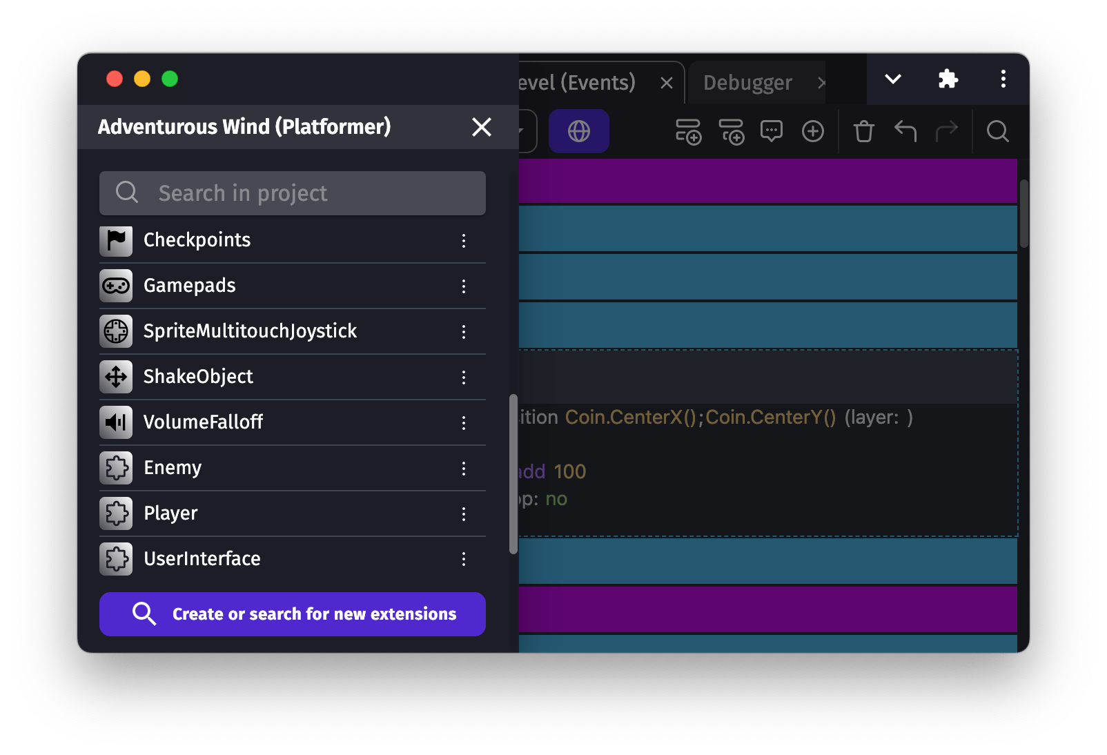Similarly to scenes or external events, functions are written with events. They allow to create new conditions, new actions and new expressions that add up to GDevelop features. They are a good way to organize events, avoid duplication and share features with the community.